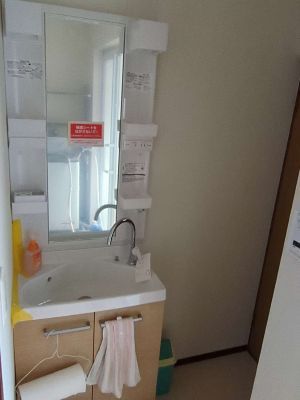 奥の扉がトイレとなっており洗面化粧台の前を通らなければならないため、少しでも奥行のないlixilリフラと言うシリーズの洗面化粧台を入れました。