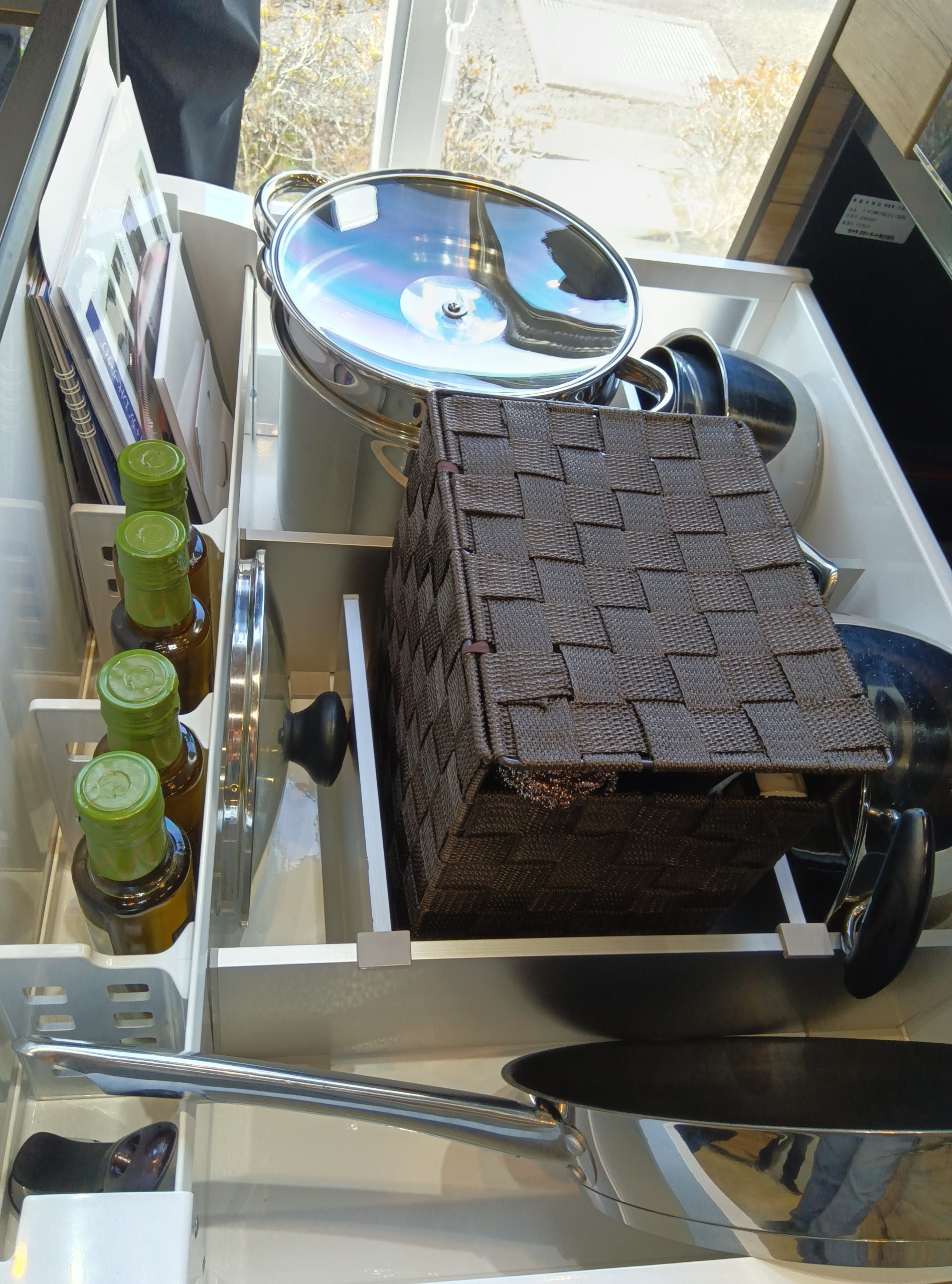 タカラスタンダードといえば、高品位なホーロー素材。お手入れも簡単で劣化しにくいのが魅力的ですよね。そして何よりマグネットが付くのでキッチンの壁一面にマグネット収納が出来ます。また、キャビネットの中にも「間仕切り名人」というマグネットで付けられる仕切りを使用することが出来ます。キッチンの収納って、お家の中でも難所だと思います。丁度いいサイズのカゴや仕切りを探すのもなかなか大変ですし、どうにか物の場所を決めたとしても、使っている間にずれてきて結局ごちゃごちゃになってしまったり、一つアイテムを買い足しただけで上手く収納が出来なくなってしまったり、、、。収納したいものが変わってもさっと対応できるので、マグネットの仕切りはとても魅力的です。