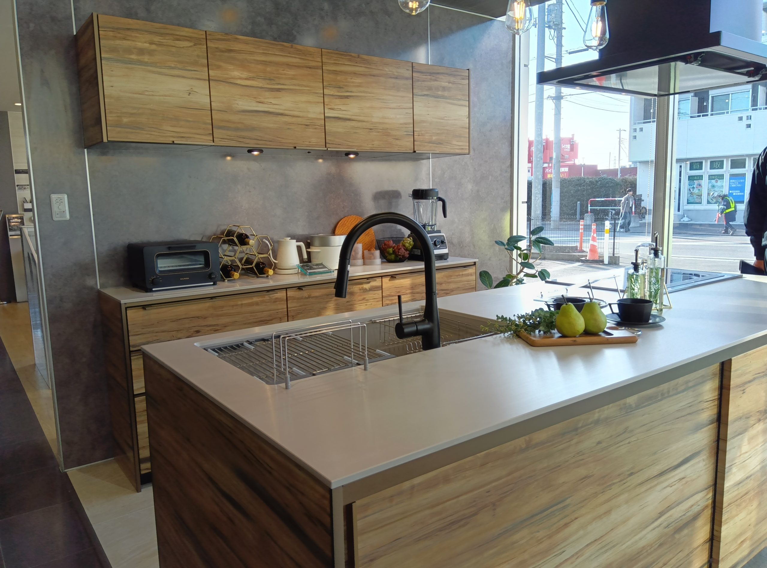 ショールームの入口すぐに、リアルな木目調のキッチンが展示されていました。水栓やレンジフードが黒いのも、最近のトレンドのようです。