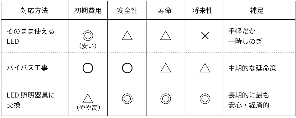 実は長期的に考えると、照明器具ごとLED対応に交換することが最も安心で経済的です。そのほかの対応は一時的な対応になってしまう可能性があります。