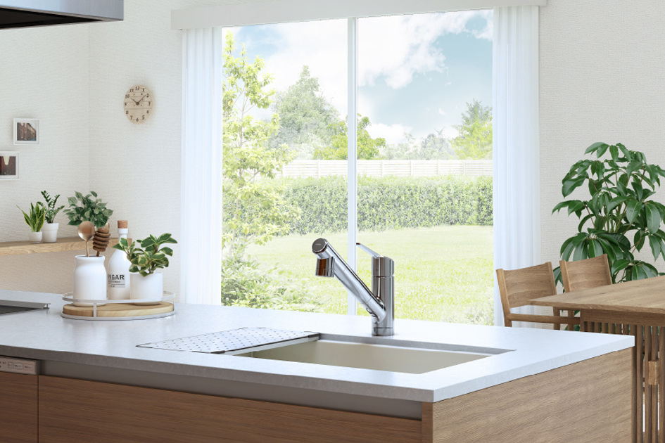 軽いクリック感のあるレバーハンドルと、蛇口上部の引き出し式ホースで片手操作やシンク外作業がスムーズに行えます。調理や洗い物を効率的に行うことができます。
