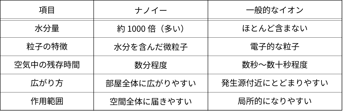 ナノイーはイオンと同じように空気中に放出される粒子ですが、性質には大きな違いがあります。ナノイーは水分量が多く、長く空気中にとどまりやすい粒子です。