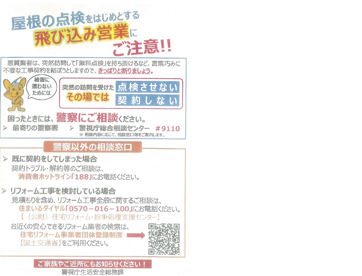 屋根や床下など自分で見る事ができない場所を無料点検とうたって訪問し点検すると言ってわざと見えないところで悪くして法外な工事代金を請求する悪徳業者がいます。弊社のお客様のお宅にも何軒もきていました。そういう訪問営業が来た時にはその場では【点検させない・契約しない】ことが大切です。しつこく困ったときには警察にご相談ください。