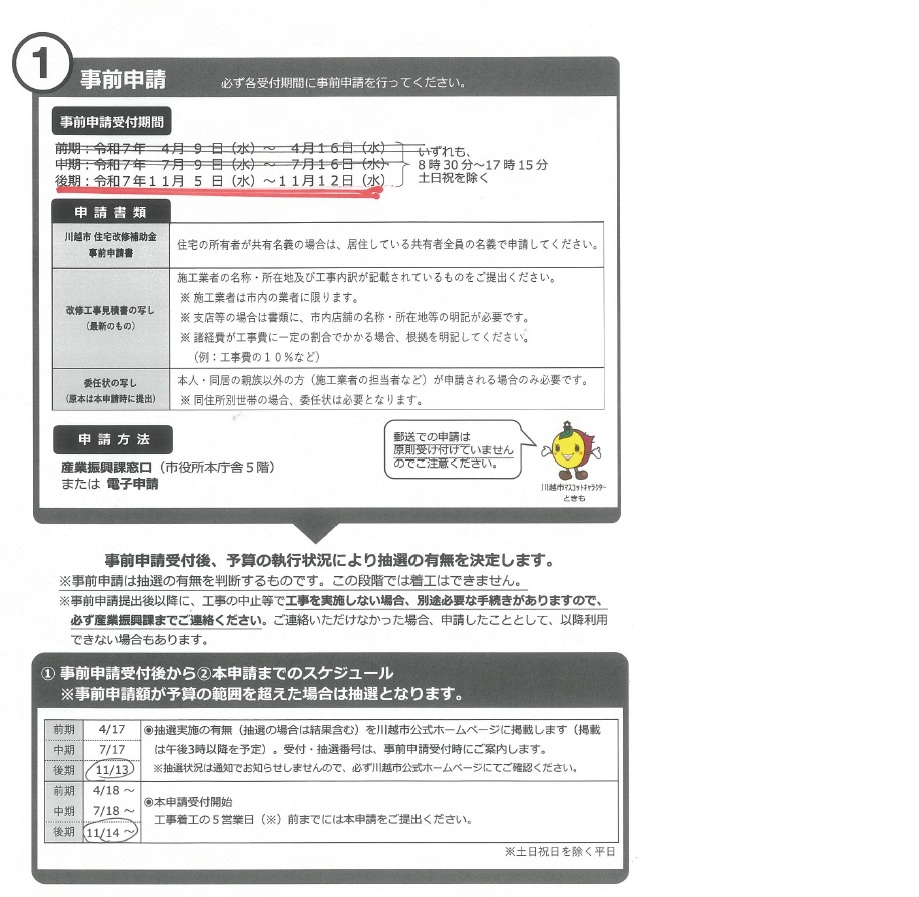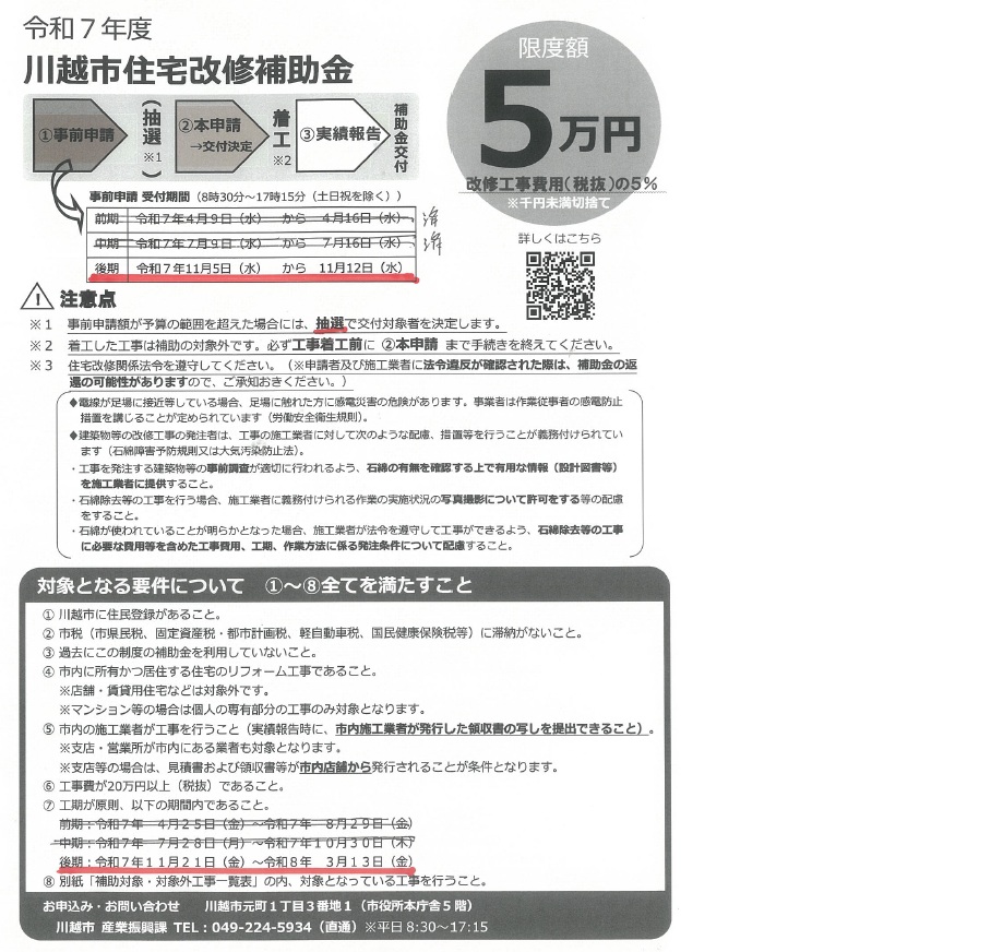 ※引用元 川越市産業振興課 ■本年度の最後の川越市住宅改修補助金の事前申請の受付日が11/5~11/12で もうすぐで間近の状態です。 最大5万円の補助金です。 ご利用の希望の方はお早めにご準備をお願い致します。