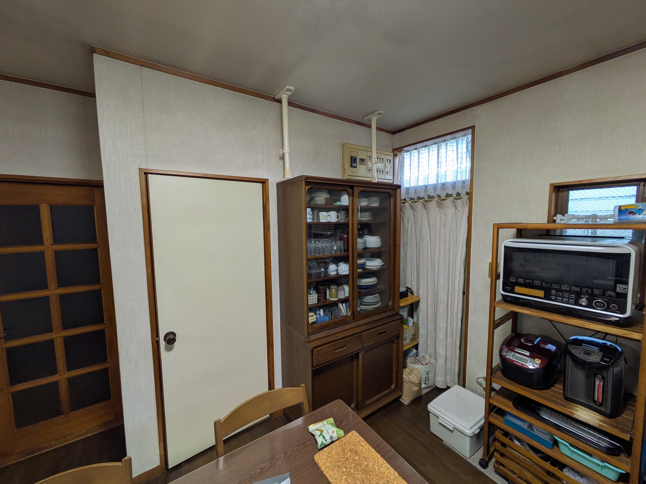 この画像は先ほどの洗濯機の裏側に当たるキッチンスペースです。食器棚の後ろの壁を移動させ洗濯機置き場をこちらのスペースに移動するご提案をさせていただきました。