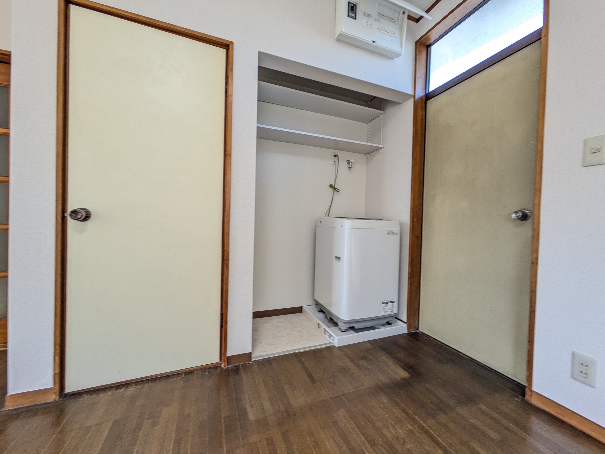 キッチン側から見ると壁が奥に移動したことで洗濯スペースが出来ました。ドラム式洗濯機にも対応できる高い位置に水栓が付いています。また、洗濯機を置いても左側のスペースに洗濯用品を置くことができます。上部には稼働棚を2段設置し、さらに収納スペースが増えています。分電盤のために下がり壁になっていますが、使いやすい位置になるようお客様と打合せしていきました。