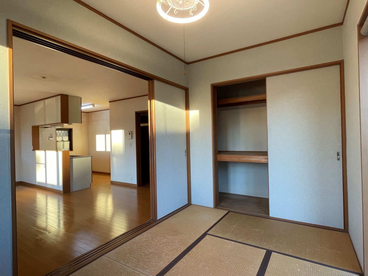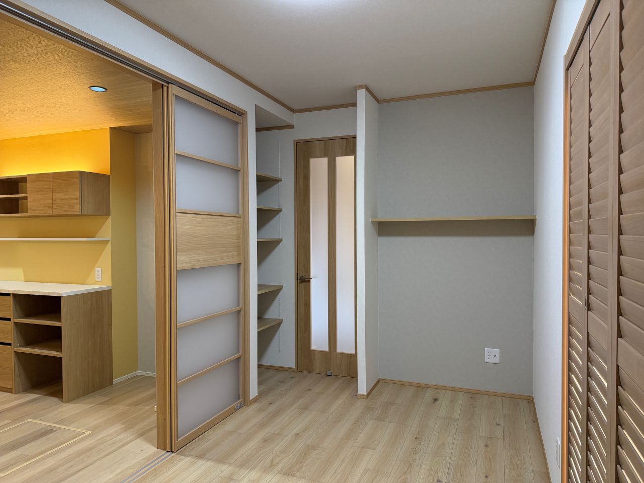 元々和室だった空間がリビングに生まれ変わりました。玄関からの動線も良くダイニングキッチン側には2枚の引き込み戸があり、一緒に居るけど、心地よい距離感が演出できます。