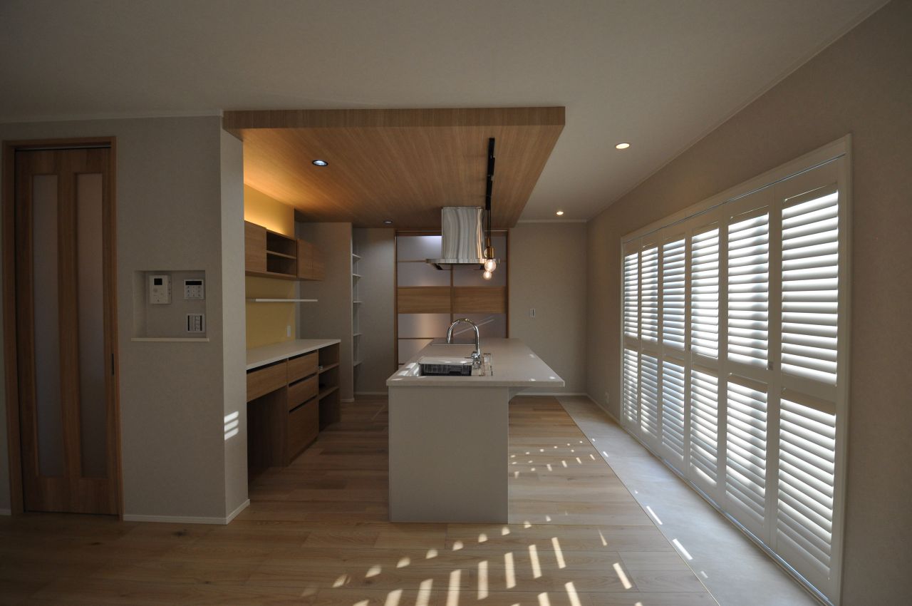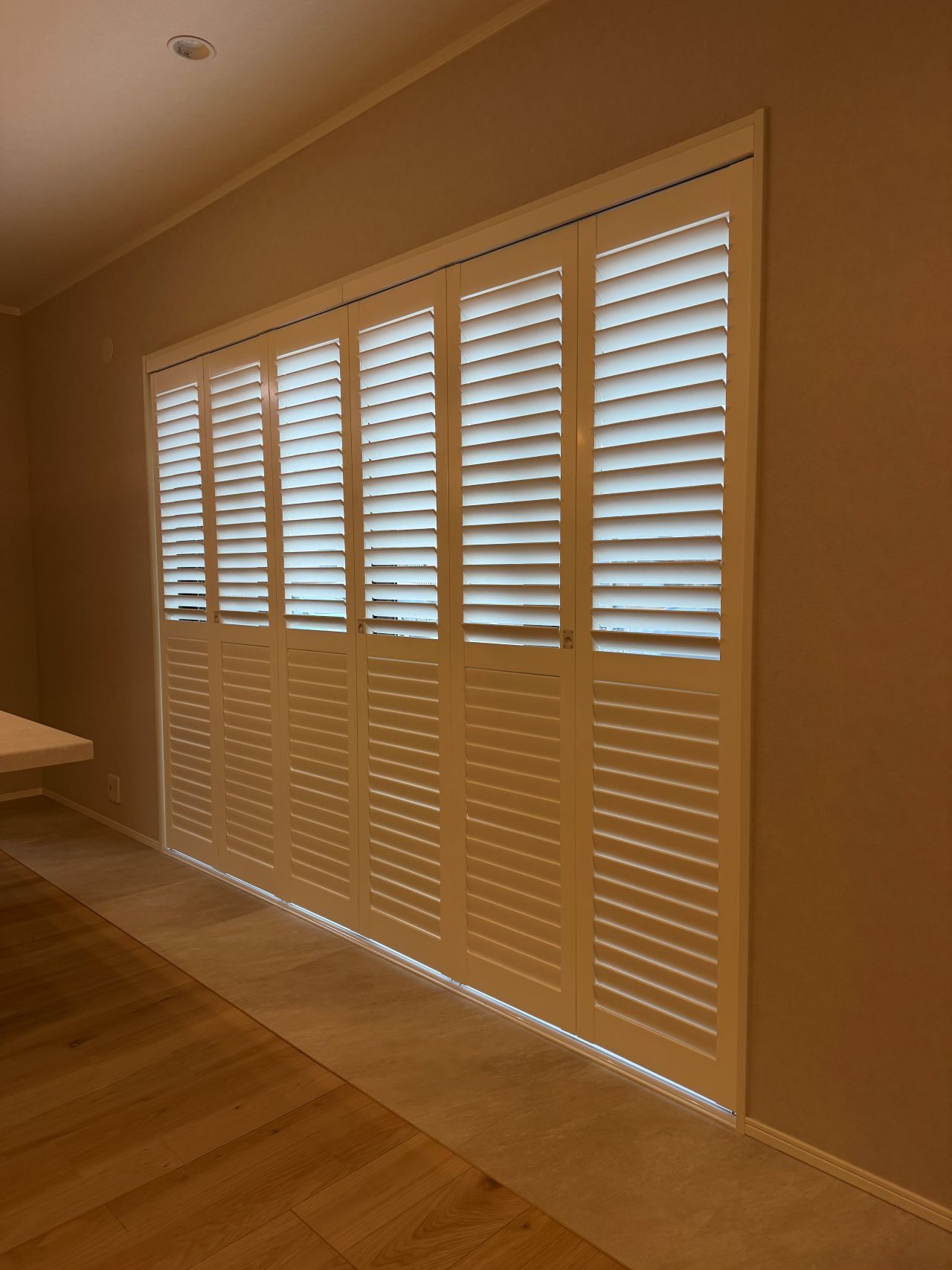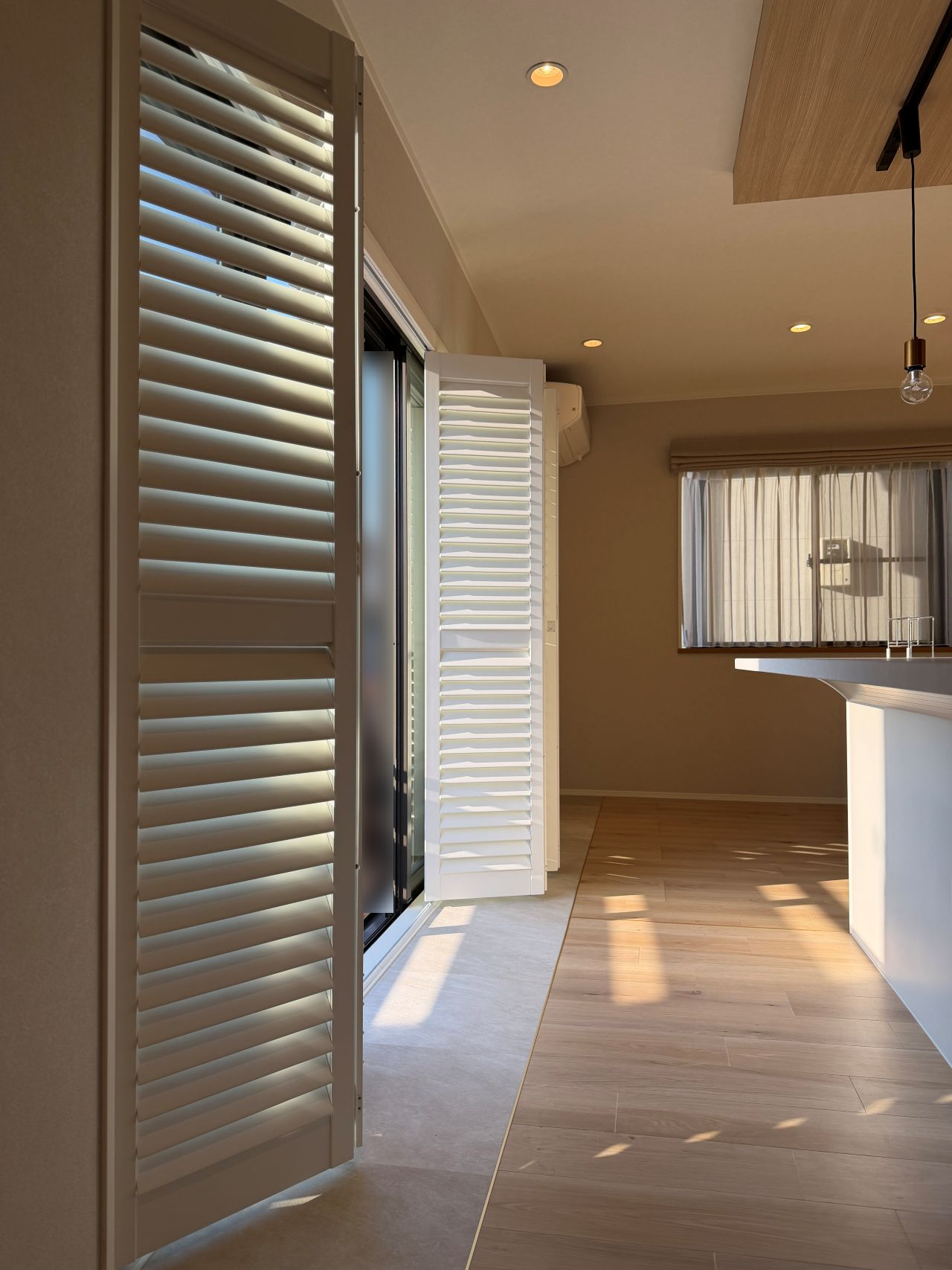 今回のリノベーションでカーテンの代わりにお選びいただいたウッドシャッターです。見た目のおしゃれさは何より、ちょうど良い風通し、さらにプライバシーの確保が出来、快適な住環境を演出します。ルーバーの一部を上げて採光を取ることが出来ます。