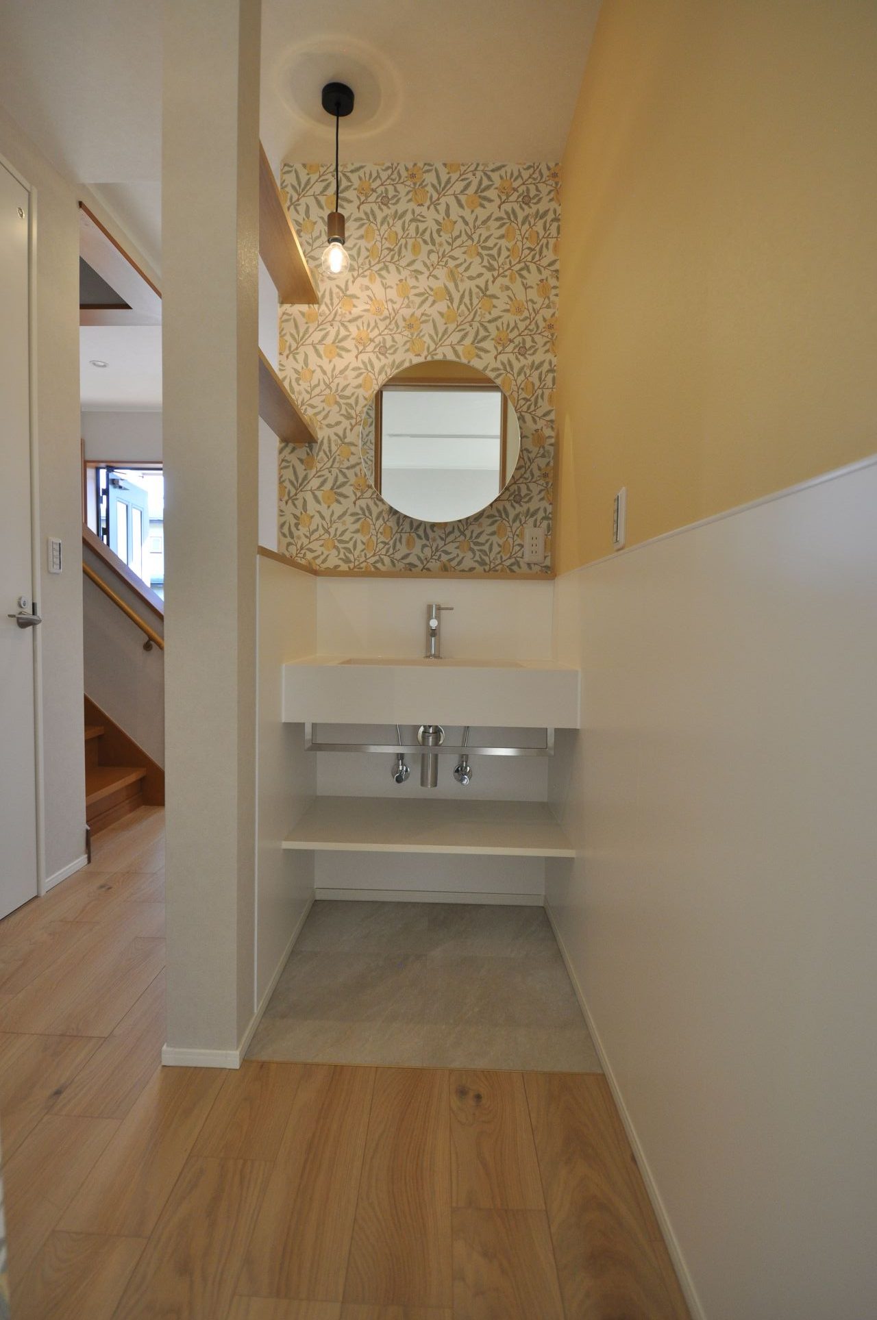 1階トイレ前に洗面スペースを設置しました。玄関からも近いのでただいま手洗いとしても機能します。洗面スペースの周りにはキッチンパネルが貼ってあり、水ハネなどの心配が無くなりました。
